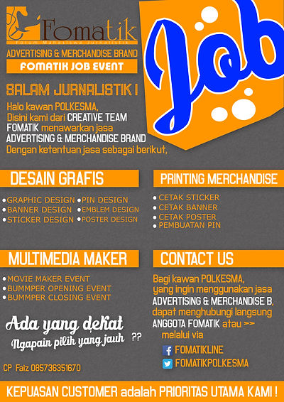 Bagi kawan POLKESMA yang ingin menggunakan jasa kami, bisa langsung menghubungi anggota Fomatik untuk pemesanan dan nego.